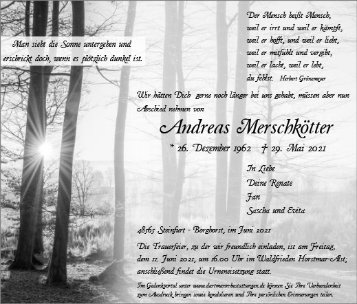 Leider ist alles vergänglich und nichts ist für ewig. Andreas, du warst über viele Jahre unser Weggefährte. Ob beim Fußball spielen, Kegeln oder die Freitag Abende bei Bernd..... Wir werden dich vermissen... warst immer ein ehrlicher und geselliger Typ und hast nie ein schlechtes Wort über andere verloren. Wir wünschen dir eine gute Reise. Eines Tages werden wir dir folgen und sehen uns dann wieder.