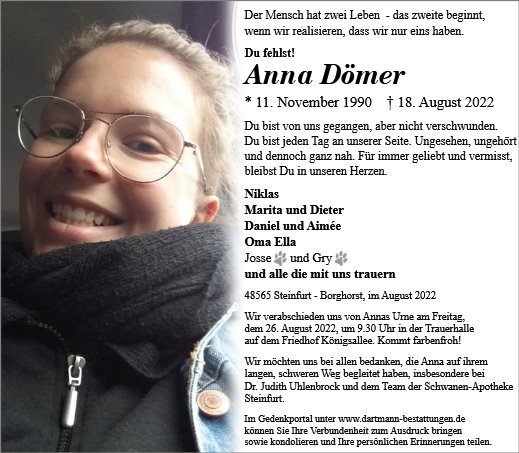 Auf dem Foto ist Anna zu sehen als Orgateamerin des Krachmacherfestivals 2019 in Nordwalde (mein Sohn Leonard war als Teamer und Schlagzeuger dabei). Wie alles war auch das Kochzelt hervorragend erstellt und organisiert, wo ich ein bisschen mitbruzzelte. Der Förderverein und die Bürgerstiftung des Bispinghofes, Ort dieses Geschehens, würden es begrüßen und unterstützen, wenn auf dem Gelände, wo sich Anna so engagiert und fröhlich bewegte, ein Baum für sie gepflanzt werden könnte. Diesen Gedanken haben ihre Freunde gehabt - eine wunderbare Idee, die viele an sie erinnern lassen würde.