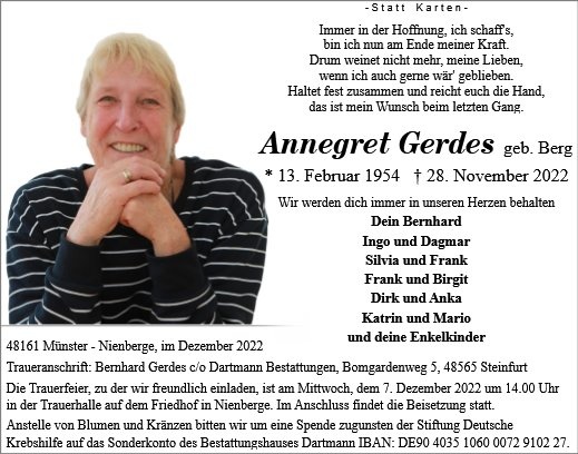 wir wünschen Ihnen von Herzen viel Kraft, dass Sie Menschen um sich haben, die Ihnen in dieser schweren Zeit beistehen und Halt geben. Zusätzlich können Sie auf dieser Gedenkseite Erinnerungen teilen und so das Andenken gemeinsam wachhalten.