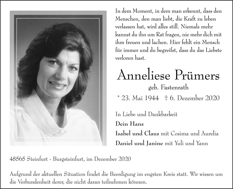 Der Text in Deiner Anzeige konnte nicht treffender gewählt werden. Ich weiß sehrwohl was Du und Deine Familie jetzt empfindest. Ich mußte meine Christl am 8. November nach 53 Ehejahren gehen lassen. Meine Kinder und Enkelkinder kennen den Schmerz und wir wünschen Dir und den Deinen viel Kraft