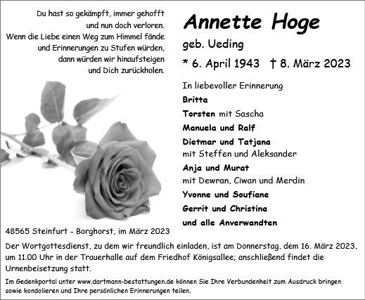 wir wünschen Ihnen von Herzen viel Kraft, dass Sie Menschen um sich haben, die Ihnen in dieser schweren Zeit beistehen und Halt geben. Zusätzlich können Sie auf dieser Gedenkseite Erinnerungen teilen und so das Andenken gemeinsam wachhalten.