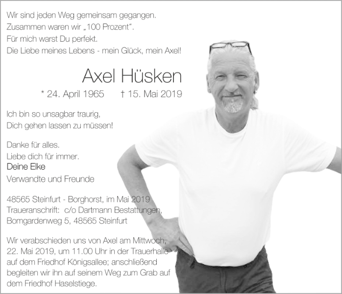 Liebe Elke, sprachlos und fassungslos standen wir heute auf dem Friedhof...wir wussten es nicht..niemand hat etwas gesagt :( Es tut mir unendlich leid:( Dein Axel war ein herzensguter Mensch und Ihr als Team das perfekte Paar. Unser tiefstes Mitgefühl und unser Beileid. Ich wünsche Dir weiterhin noch viel Kraft und eines weiß ich sicher..die geliebten Menschen werden immer an unserer Seite sein..Sie sind niemals ganz weg,Sie haben nur die Seiten gewechselt. Fühl Dich mal gedrückt. Familie Mense