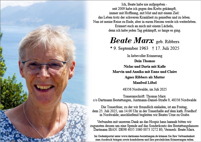 Ich hoffe aber, dass Euch die feste Verbundenheit, Liebe und Erinnerung durch diese Zeit und Euer weiteres Leben tragen wird und der Schmerz im liebevollen Gedenken an Beate allmählich verblasst und Eurem Lebensmut Platz macht. Das wäre sicher auch in ihrem Sinne.