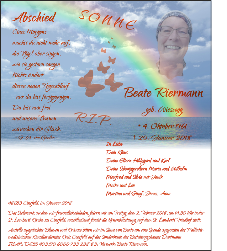 Du warst so ein liebenswerter Mensch mit einem riesengroßen Herzen. Du hast alles für die Menschen getan, die dir am Herzen liegen. Du hast uns allen unendliche viele schöne Augenblicke geschenkt. In dieser Form wirst du das nie wieder tun, aber in anderer Form. Wir müssen nur erst einmal richtig begreifen, dass du nicht weg bist. Du bist nach nebenan gegangen. Wir können dich nicht mehr sehen, aber wir können dich fühlen. Deine Seele lebt in unseren Herzen weiter. Wir müssen nur erst lernen, dass wir dich nur noch spüren können. Dich, dein Vertrauen und deine Liebe. Das wird wohl noch ein bisschen dauern, aber irgendwann wird es den Schmerz erträglicher machen. Nicht heute, nicht morgen – aber irgendwann wird dieser Tag kommen. Und mache dir keine Sorgen, dieser Tag wird auch für deinen Mann und deine Familie und Freunde kommen. Das braucht halt nur seine Zeit. Du weißt, sie sind nicht alleine und du selber wirst auch deinen Teil dazu tun. Davon bin ich fest überzeugt.