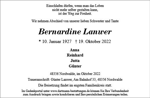 Liebe Änne und Familie, unser Mitgefühl zum Tod von Bendine! In Erinnerung an Kindertagen: Sie war meine große Cousine, die im Notfall auch mal meine Mama ersetzen konnte👍Nur gute Erinnerungen- nun hat sich der Kreis, hoffentlich sanft, geschlossen!