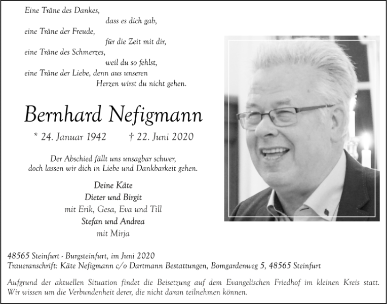 Wir trauern mit seiner Frau Käte und seinen Angehörigen. Bernhard war ein liebenswerter, hilfsbereiter und immer freundlicher Mensch. Wir freuen uns darüber, das wir ihn in seiner Art und Persönlichkeit kennen und schätzen lernen durften. Wir werden uns gerne an ihn erinnern.