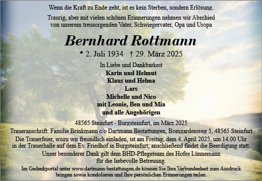 wir wünschen Ihnen von Herzen viel Kraft, dass Sie Menschen um sich haben, die Ihnen in dieser schweren Zeit beistehen und Halt geben. Zusätzlich können Sie auf dieser Gedenkseite Erinnerungen teilen und so das Andenken gemeinsam wachhalten.