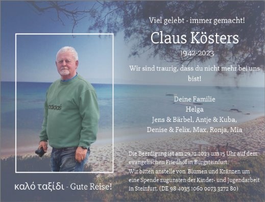 Ich wünsche euch die Kraft und die Hoffnung die zeigt, dass sich auch ohne Claus ,-so schwer es auch fällt, das Leben noch Freude und Zufriedenheit bringen kann.