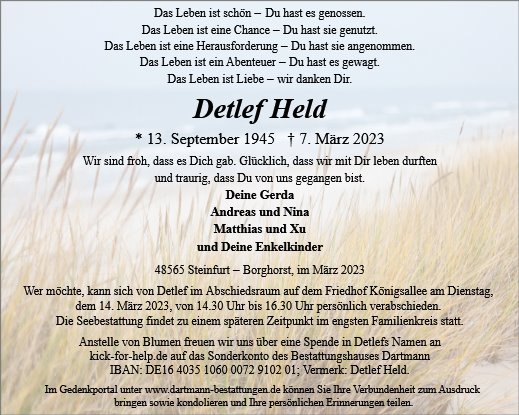 Siggi hat mehr Abenteuer hinter sich als manche Generationen je erleben. Er hat so viele Menschen berührt und einen bleibenden Eindruck hinterlassen. Er hat Fairness im sozialen, im Sport und im Umgang mit Allen nicht nur gelebt, sondern gefördert. Das Wort was uns einfällt wenn wir an den Ehemann, den Vater, den Menschen Detlef 'Siggi' Held denken ist nicht mit Trauer behaftet, sondern ein ehrliches: Danke!