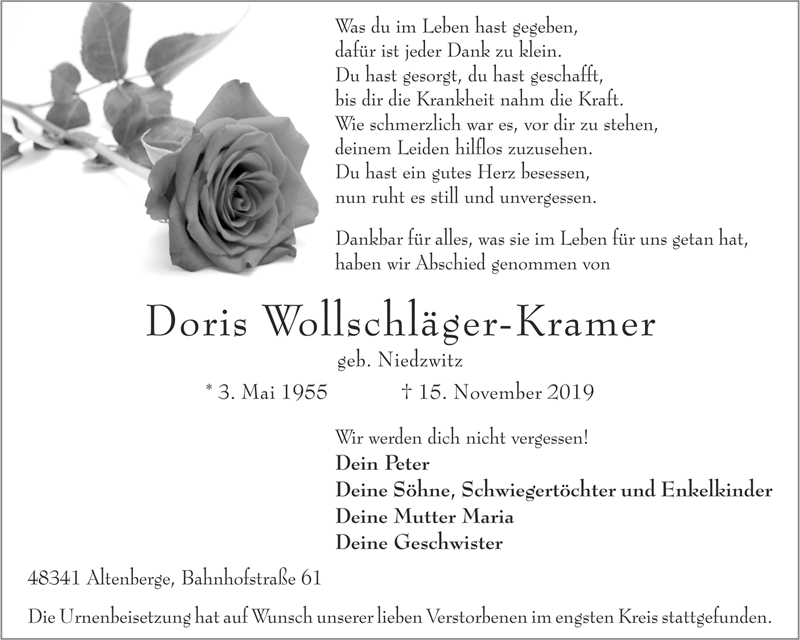 Wieder einmal wird klar, dass man sich nicht auf den Verlust eines lieben Menschen einstellen kann. Auch wenn wir wussten, der Weg von Doris im Leben ist nicht mehr lang, tut es einfach nur weh. Diesen Schmerz müssen wir annehmen und versuchen ihn so verarbeiten, dass bald dankbare und liebevolle Erinnerung daraus wird.