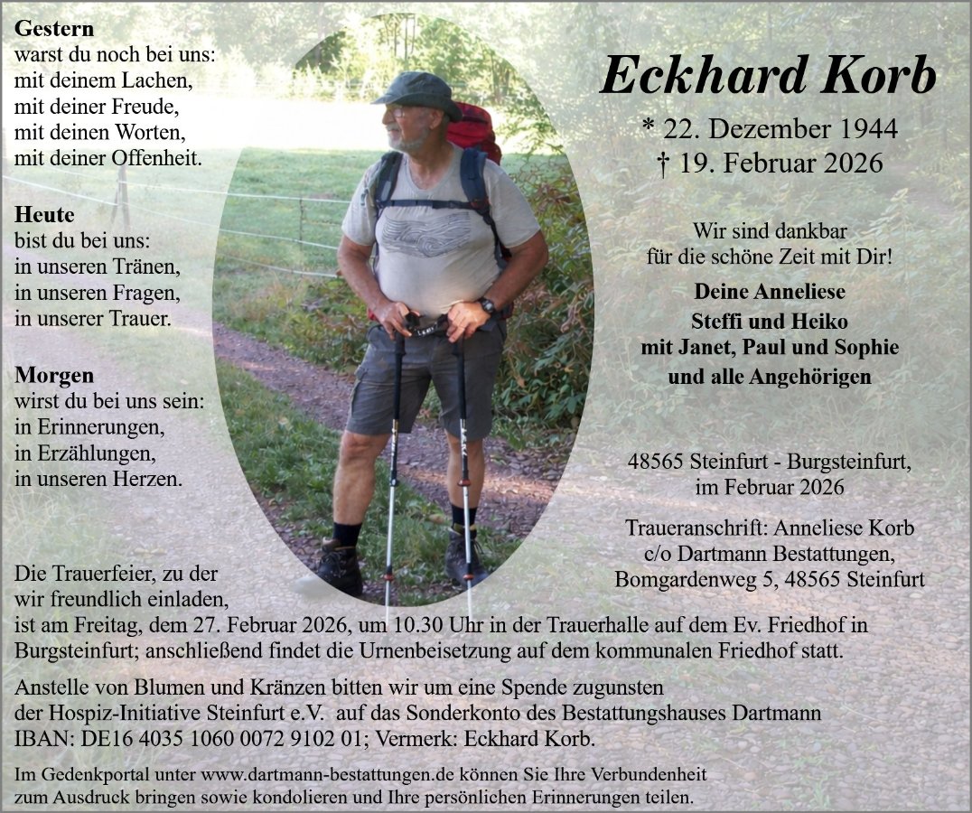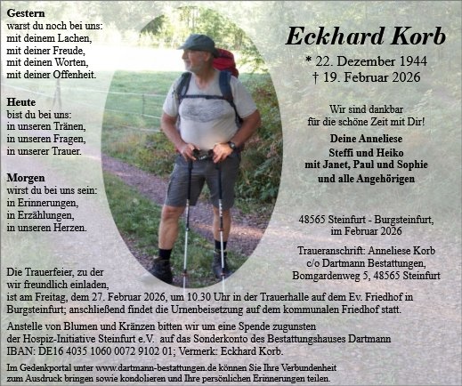Liebe Angehörige, wir wünschen Ihnen von Herzen viel Kraft, dass Sie Menschen um sich haben, die Ihnen in dieser schweren Zeit beistehen und Halt geben. Zusätzlich können Sie auf dieser Gedenkseite Erinnerungen teilen und so das Andenken gemeinsam wachhalten. In tiefer Verbundenheit