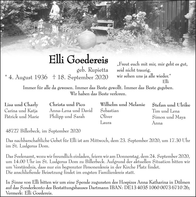 wir wünschen Ihnen von Herzen viel Kraft, dass Sie Menschen um sich haben, die Ihnen in dieser schweren Zeit beistehen und Halt geben. Zusätzlich können Sie auf dieser Gedenkseite Erinnerungen teilen und so das Andenken gemeinsam wachhalten.