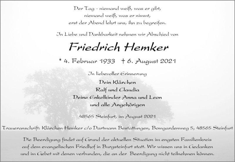 wir wünschen Ihnen von Herzen viel Kraft, dass Sie Menschen um sich haben, die Ihnen in dieser schweren Zeit beistehen und Halt geben. Zusätzlich können Sie auf dieser Gedenkseite Erinnerungen teilen und so das Andenken gemeinsam wachhalten.