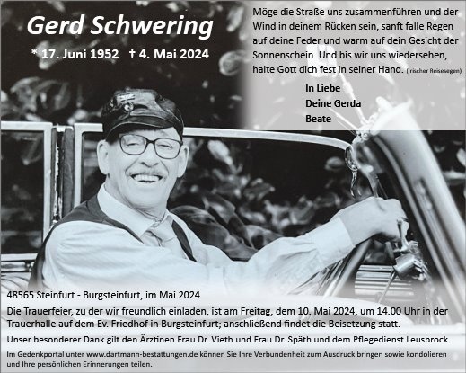 Wir trauern mit euch um Gerd, den wir auch nur von Beates Schilderungen kannten. Ihr habt ihm ein würdevolles Sterben in seinem Zuhause ermöglicht. Dafür zollen wir euch Hochachtung, denn das war sicher eine schwere Zeit für euch.