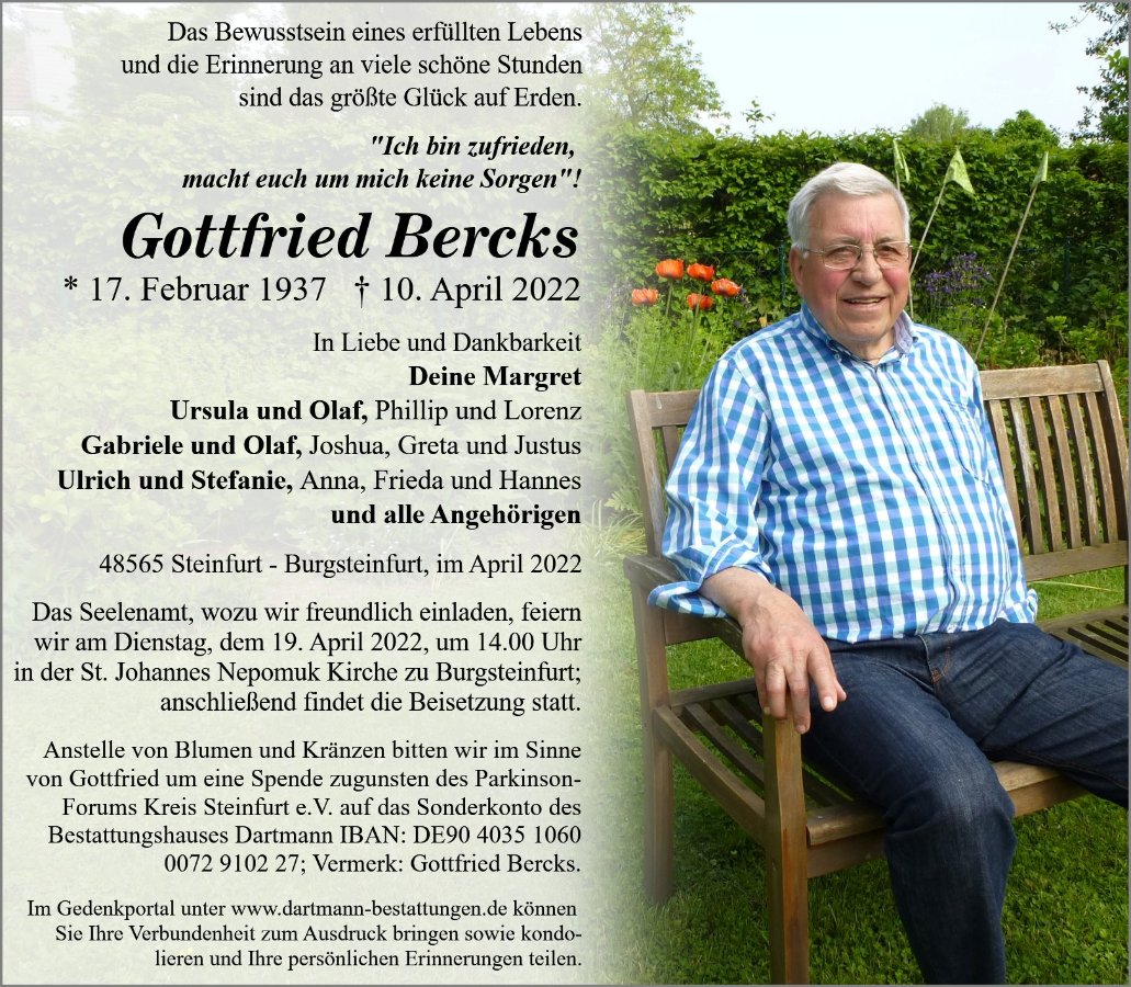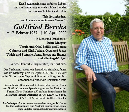 viele bezeichnende und zutreffend auch sehr herausragende Beschreibungen über Gottfried konnten wir lesen. Ich möchte eine ergänzen. Wir verlieren in Gottfried einen sehr noblen Menschen. Er hätte dieses Wort sicher nicht für sich verwandt. Aber es trifft zu. Gottfried hatte einen feinen Charakter. Großzügig in der Zugewandtheit für außerordentlich viele Belange des Gemeinwohls, vortrefflich in seiner westfälisch offenen, individuellen und unermüdlichen Art anzupacken und positiv zu wirken. Wir betrauern den Verlust eines im besten Sinne ausgezeichneten Mannes. Unsere Gedanken gelten Dir, liebe Margret, und Deiner Familie.