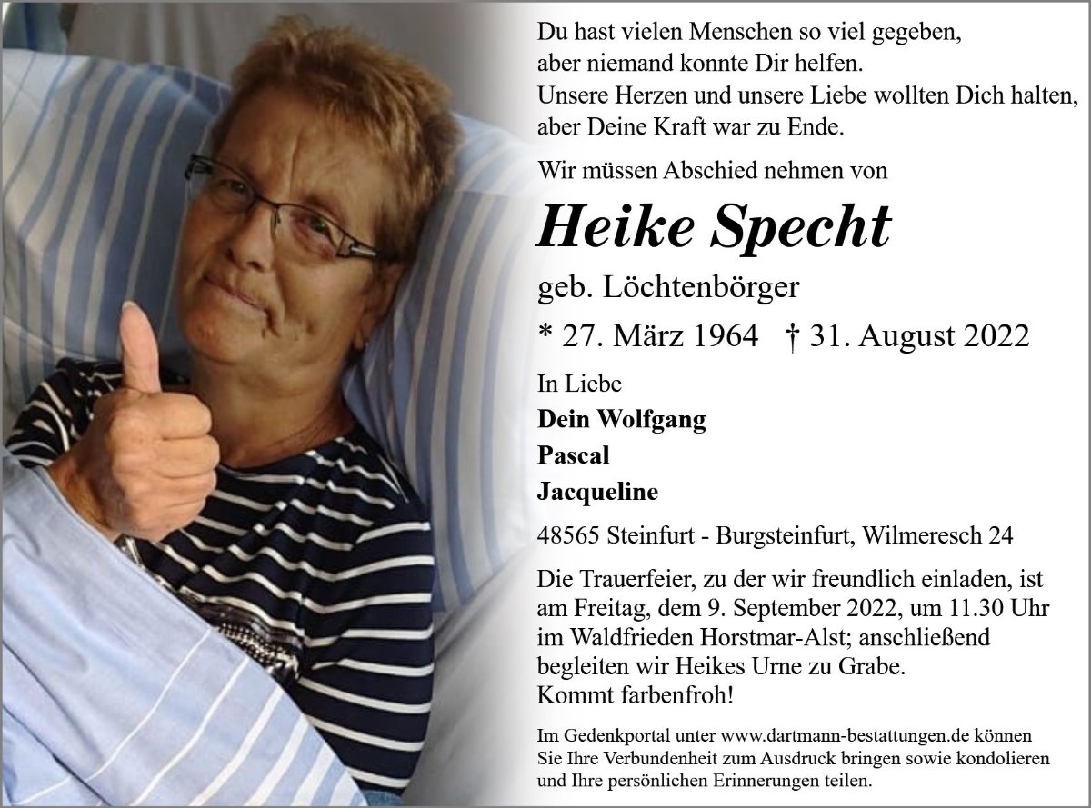 Lieber Wolfgang, zum Tod von Heike möchten wir Dir und Deinen Kindern unsere Anteilnahme aussprechen. Die Nachricht von ihrem Tod hat uns sehr bestürzt. Sie war so ein umgänglicher und ehrlicher Mensch. Wir wünschen Dir für die kommenden Wochen viel Kraft, diesen schweren Schicksalsschlag zu verarbeiten.