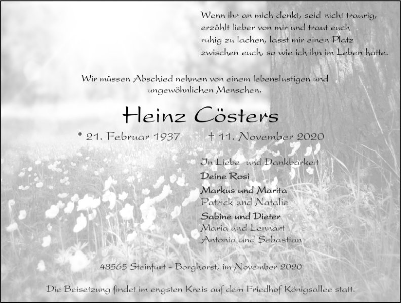 wir wünschen Ihnen von Herzen viel Kraft, dass Sie Menschen um sich haben, die Ihnen in dieser schweren Zeit beistehen und Halt geben. Zusätzlich können Sie auf dieser Gedenkseite Erinnerungen teilen und so das Andenken gemeinsam wachhalten.