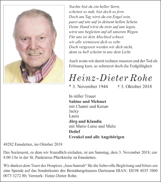 Die Gedenkfeier findet am 03. November 2018 um 08:00 Uhr in der St. Pankratius Kirche in Emsdetten statt.