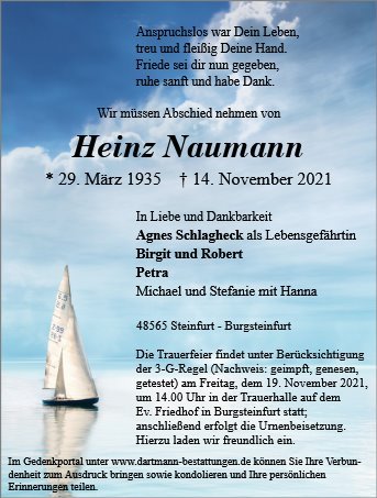 Die Segelsportgemeinschaft Stormvogel Steinfurt e.V. trauert um einen beliebten Segelkameraden. Heinz war 32 Jahre aktives Mitglied des Vereins und fest in die Senioren-Arbeitsgruppe eingebunden. Wir werden ihn stets in guter Erinnerung behalten. In tiefer Trauer,