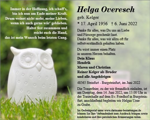 Ich bin unendlich traurig was geschehen ist. Helga wird uns allen sehr fehlen. Sie gehörte einfach zu dir Klaus.