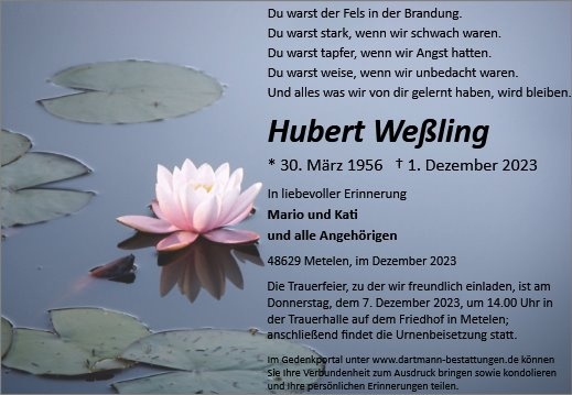 Meine herzliche Anteilnahme . Ich wünsche euch viel Kraft für die nächste Zeit und viele schöne Erinnerungen an Hubert. Ulla