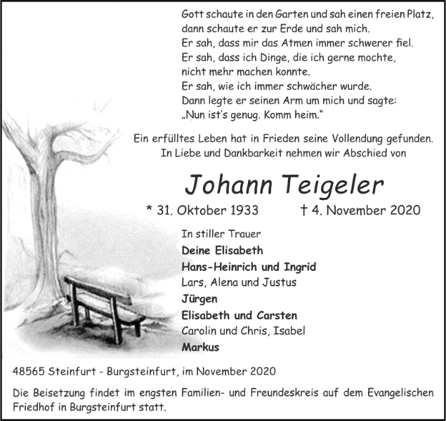 Viele Jahre durften wir mit Johann gemeinsam erleben. Ein liebenswerter, zuverlässiger, aufrechter Münsterländer, der gerne im Kreise seiner Lieben, der Nachbarn, der Freunde und Bekannten lebte. Ein arbeitsamer Mann, immer für die Familie da. Sein ehrenamtliches Engagement stellte er auch seiner Heimatstadt zur Verfügung. Als liberaler Ratsherr und stellvertretender Bürgermeister war es ihm stets ein Anliegen, Probleme auch aus der Sichtweise der Bauernschaften zu beleuchten und zu lösen. Er bezeichnet sich selbst gerne und nicht ohne berechtigten Stolz als "Bürgermeister mit Schwielen an den Händen".