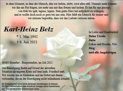 wir wünschen Ihnen von Herzen viel Kraft, dass Sie Menschen um sich haben, die Ihnen in dieser schweren Zeit beistehen und Halt geben. Zusätzlich können Sie auf dieser Gedenkseite Erinnerungen teilen und so das Andenken gemeinsam wachhalten.