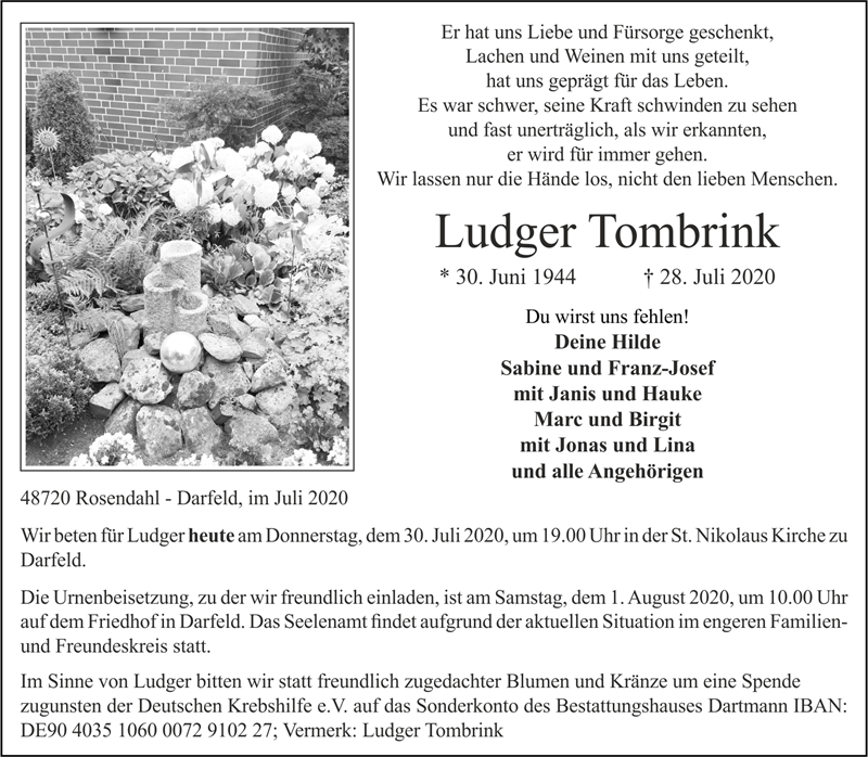 wir wünschen Ihnen von Herzen viel Kraft, dass Sie Menschen um sich haben, die Ihnen in dieser schweren Zeit beistehen und Halt geben. Zusätzlich können Sie auf dieser Gedenkseite Erinnerungen teilen und so das Andenken gemeinsam wachhalten.