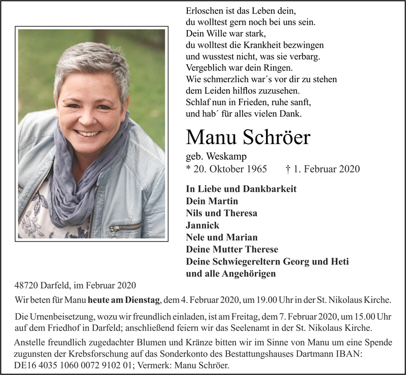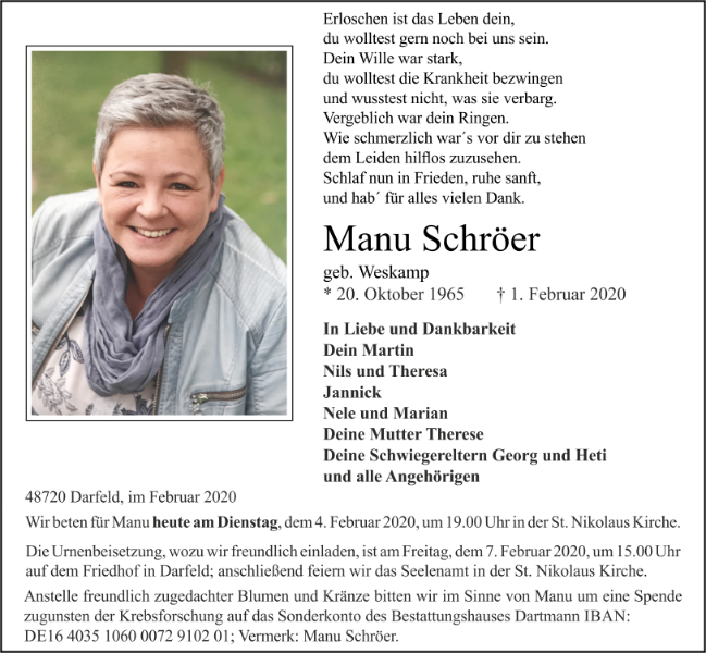 Hallo ihr Lieben, wir bitten darum keine Blumen zu versenden. Deshalb bitten wir um eine Spende zugunsten der Krebsforschung auf das Sonderkonto des Bestattungshauses Dartmann IBAN: DE16 4035 1060 0072 9102 01; Vermerk: Manu Schröer.