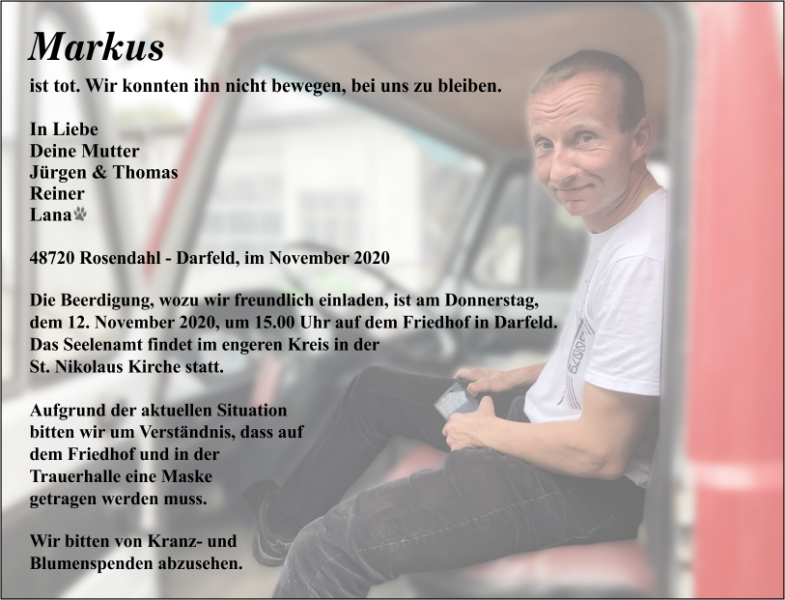 Deiner Mutter, deinen Brüdern und der weiteren Familie wünschen wir unser herzliches Beileid und die Kraft, mit diesem unvorstellbaren Schicksalsschlag einigermaßen umzugehen.