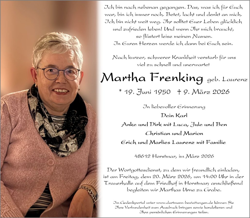 Liebe Angehörige, wir wünschen Ihnen von Herzen viel Kraft, dass Sie Menschen um sich haben, die Ihnen in dieser schweren Zeit beistehen und Halt geben. Zusätzlich können Sie auf dieser Gedenkseite Erinnerungen teilen und so das Andenken gemeinsam wachhalten. In tiefer Verbundenheit