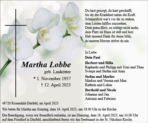 wir wünschen Ihnen von Herzen viel Kraft, dass Sie Menschen um sich haben, die Ihnen in dieser schweren Zeit beistehen und Halt geben. Zusätzlich können Sie auf dieser Gedenkseite Erinnerungen teilen und so das Andenken gemeinsam wachhalten.
