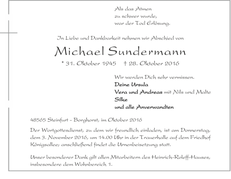 Michael Sundermanngestorben am 28. Oktober 2016