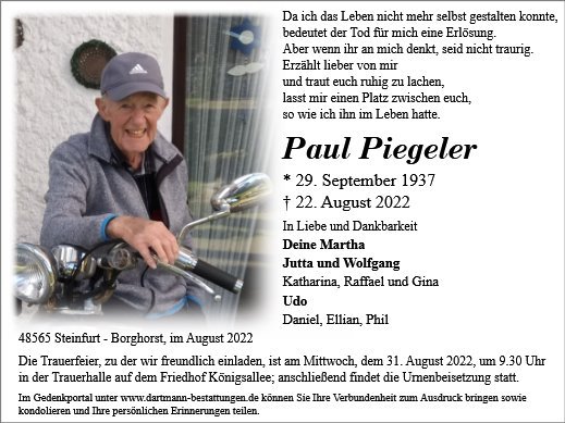 Lieber Paul,wir werden Dich immer in unseren Herzen tragen. Wir wünschen den ewigen Frieden, Danke daß wir Dich hatten. Ein stiller Gruß von Gudi Acki und Family