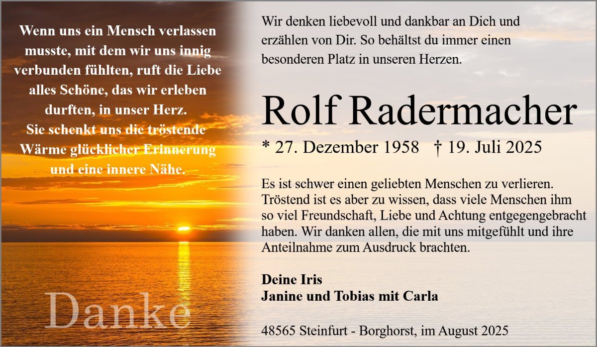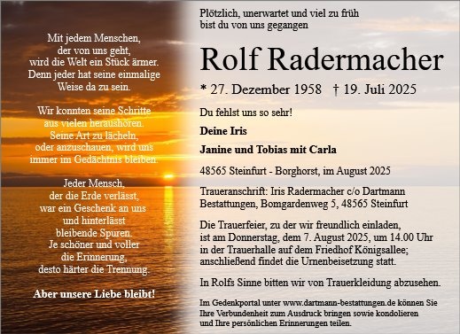 Tief betroffen hat mich die Nachricht von Rolfs Tod. Ich kannte ihn über viele Jahre.Möge die Zeit euch helfen, diesen Verlust zu verarbeiten.