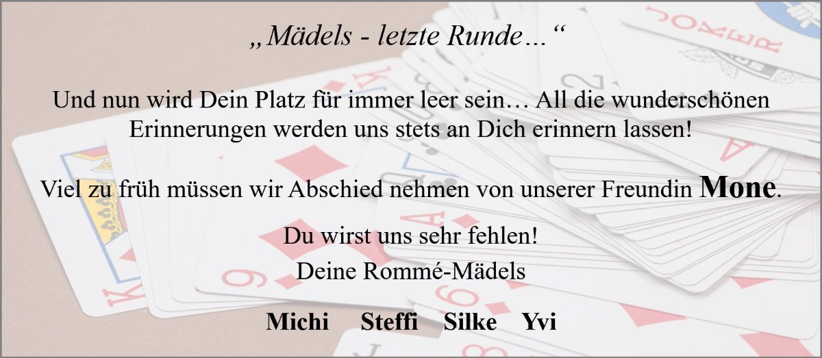 Dein Mann und Conny, die dich so liebevoll begleitet haben in den letzten Wochen, dürfen sich auf ein Wiedersehen mit dir freuen! So glaube ich daran, dass du sie lächelnd und voller Liebe empfangen wirst.