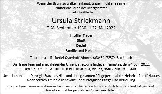 wir wünschen Ihnen von Herzen viel Kraft, dass Sie Menschen um sich haben, die Ihnen in dieser schweren Zeit beistehen und Halt geben. Zusätzlich können Sie auf dieser Gedenkseite Erinnerungen teilen und so das Andenken gemeinsam wachhalten.