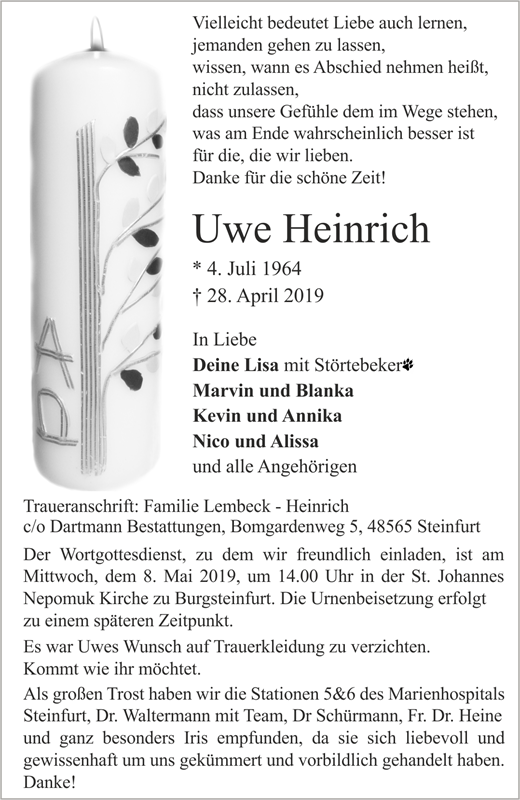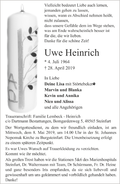 Einen lieben Menschen zu verlieren schmerzt und macht traurig. Mögen die schönen Erinnerungen an dich die Trauer erleuchten. Lieber Uwe, du warst ein besonderer Mensch, der mich Einiges gelehrt hat. Leider kannten wir uns nur sehr kurz. Von deinem Leiden dich erlöst zu wissen spendet Trost. Ruhe in Frieden.