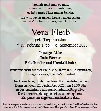Liebe Vera, Du fehlst mir so sehr. Ich werde Dich immer in meinem Herzen tragen. In ewiger Liebe dein Werner