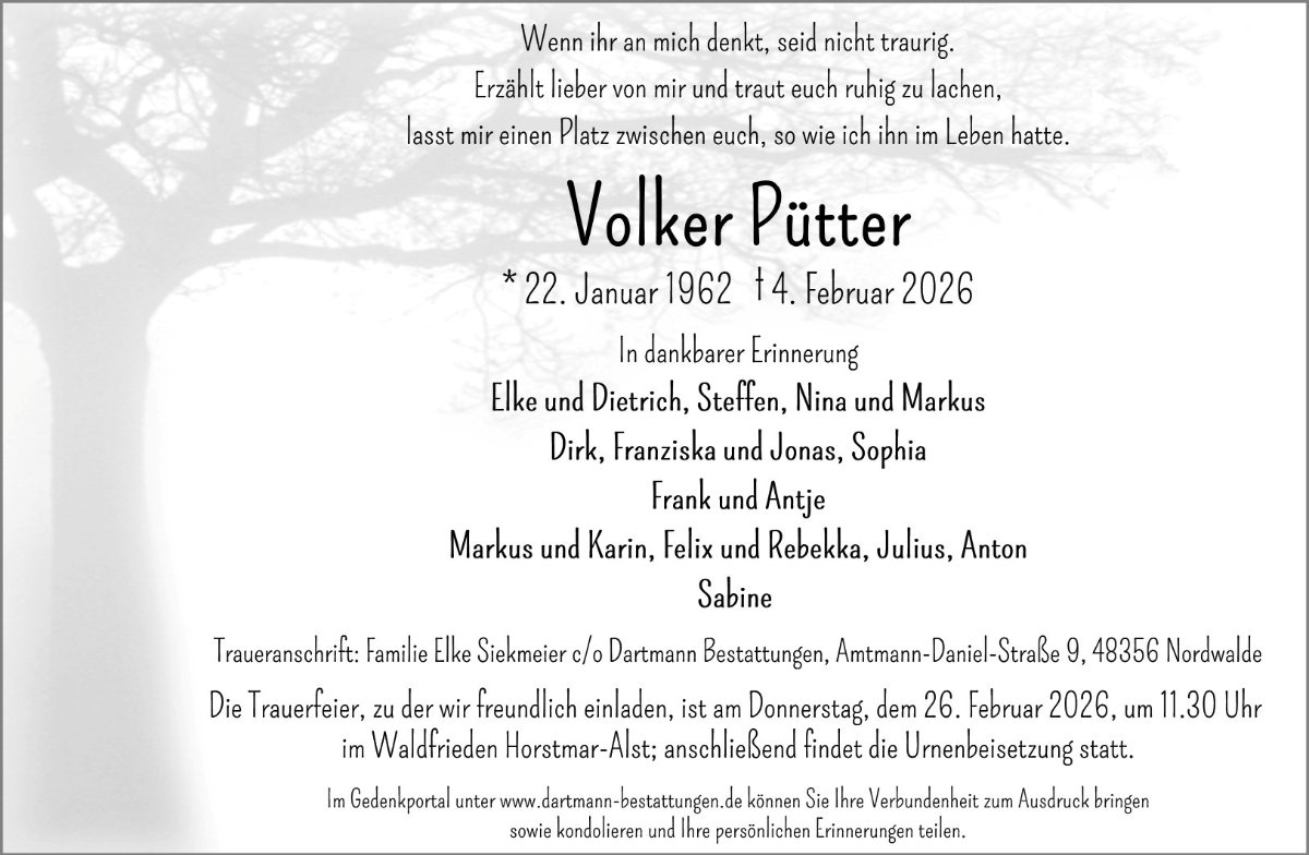 Liebe Angehörige, wir wünschen Ihnen von Herzen viel Kraft, dass Sie Menschen um sich haben, die Ihnen in dieser schweren Zeit beistehen und Halt geben. Zusätzlich können Sie auf dieser Gedenkseite Erinnerungen teilen und so das Andenken gemeinsam wachhalten. In tiefer Verbundenheit