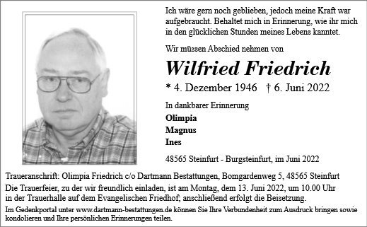 Sehr traurig haben wir Wilfrieds Namen in der Zeitung lesen müssen....