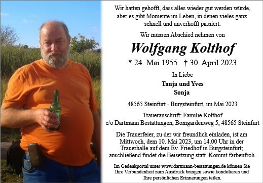 Liebe Familie Kolthof, unser herzliches Beileid zum Tod von Wolfgang. Wir waren sehr überrascht von der Nachricht, hatten nicht damit gerechnet. Viel Kraft für die nächste Zeit. Familie Weiner